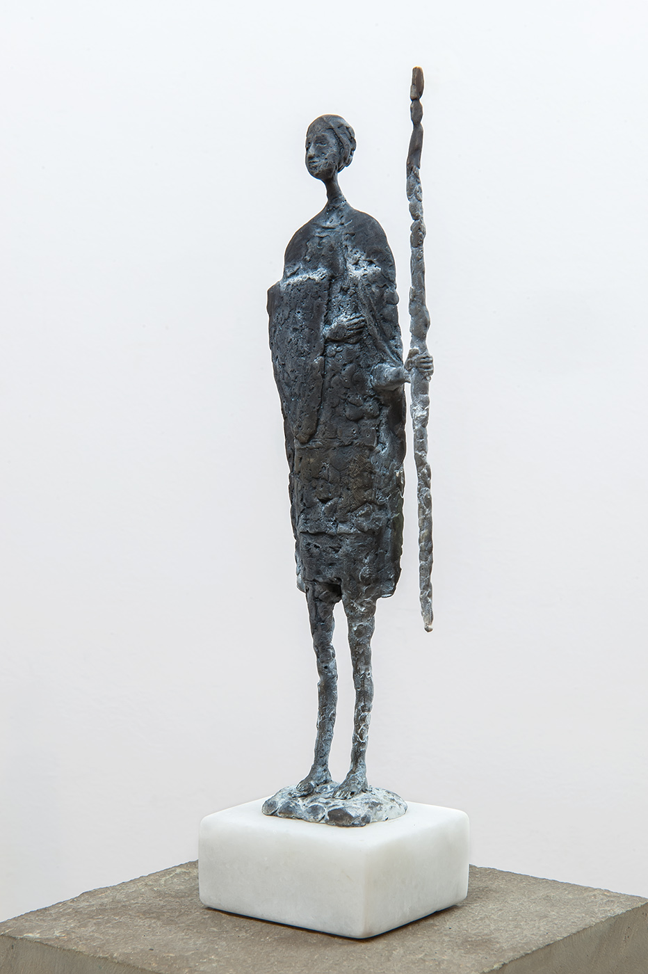 Спис і щит у композиції трактуються не як знаряддя агресії, а як символи захисту, внутрішньої дисципліни та відповідальності. Шорстка фактура бронзи, що зберігає сліди ручної обробки, підкреслює крихкість людської фігури та водночас її стійкість перед часом.