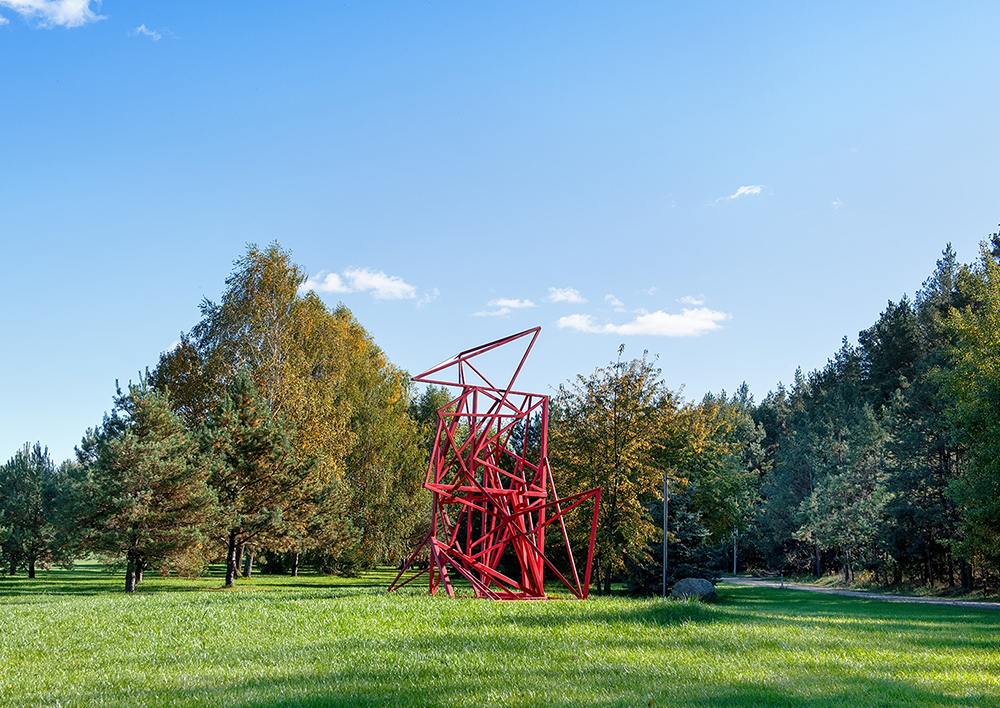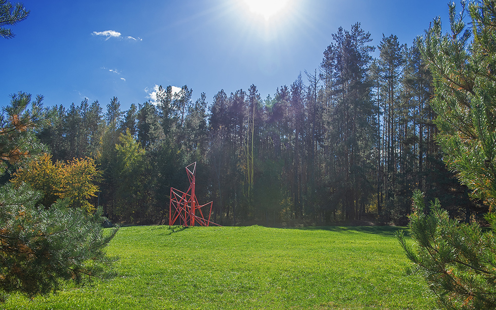 The sculpture adds a human dimension to the natural landscape, enriching it with constructivist geometric elements.
