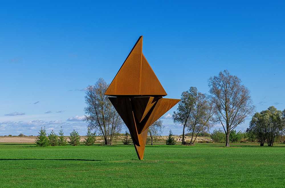 The massive object, seemingly shaped by swift winds, balances on a single fulcrum, representing the precariousness of the status quo. The dynamic interaction between and the rhythm of sharp triangles united into a single massive steel beam concentrate the tensions and responsibility of the present historical moment.